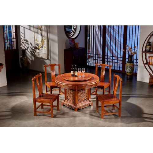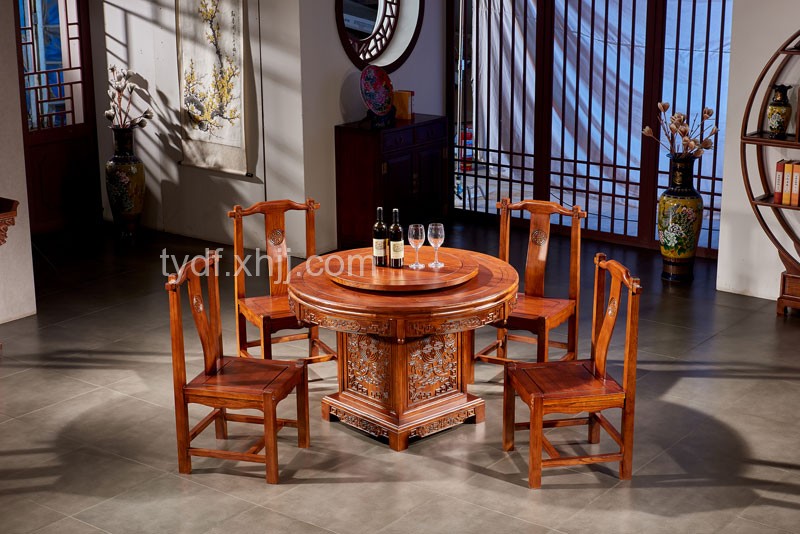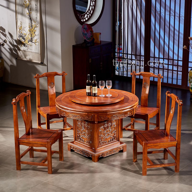 | 商品: | 榆木(mù)餐桌圓形雕花(huā)帶轉盤仿古餐桌椅組合02 |