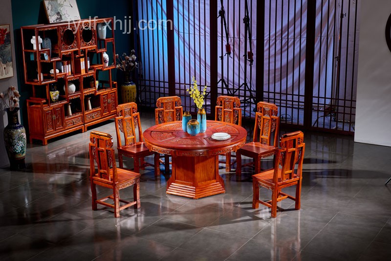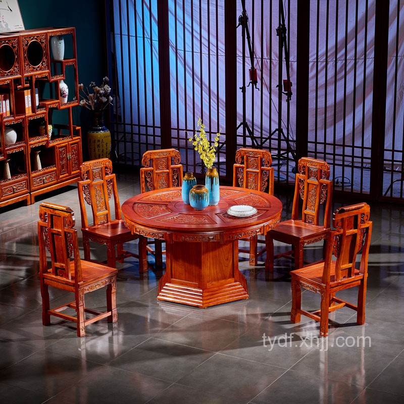 新中式雕花(huā)榆木(mù)圓形餐桌高(gāo)背餐椅組合06_詳細介紹